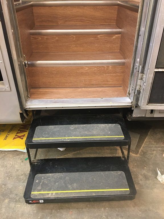 Regency entry steps and many coaches do not have the same rise and foot area on each step. See in the picture below, the top rise is 10.5 inches. The second step is 8 inches. The different rise amounts cause a tripping hazard, especially for older Barth owners. Ask Nick Cagle about this?