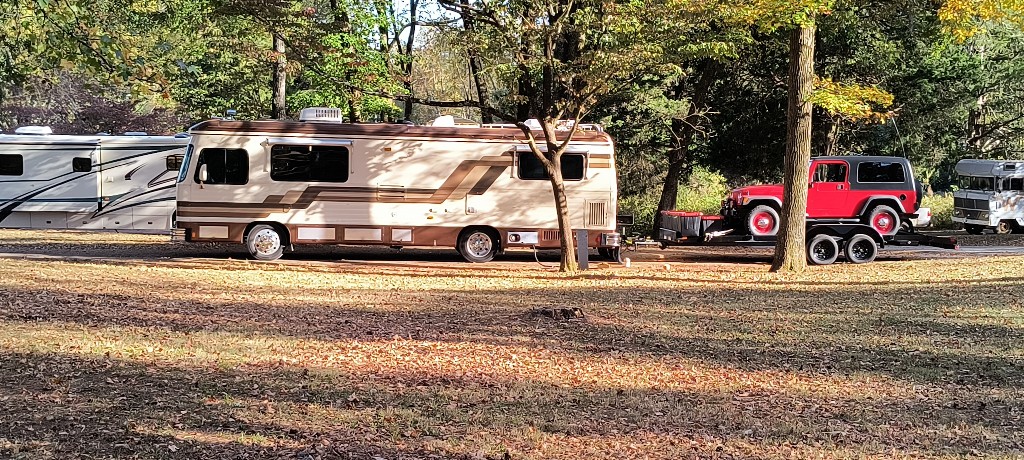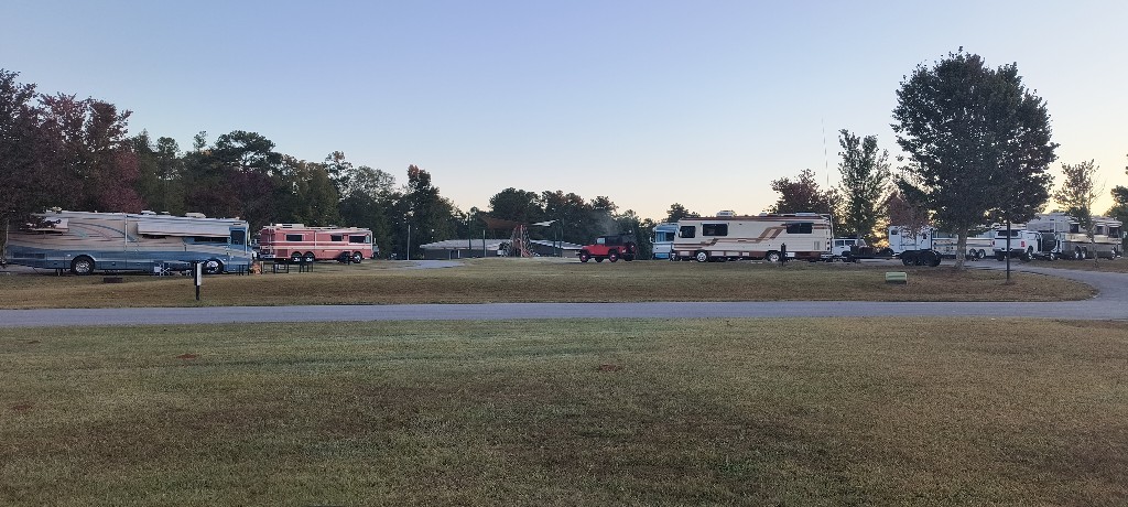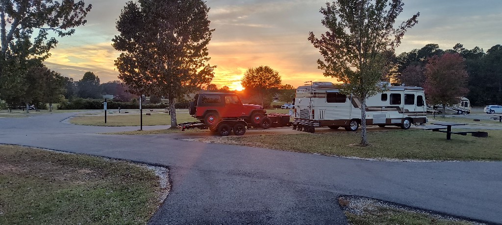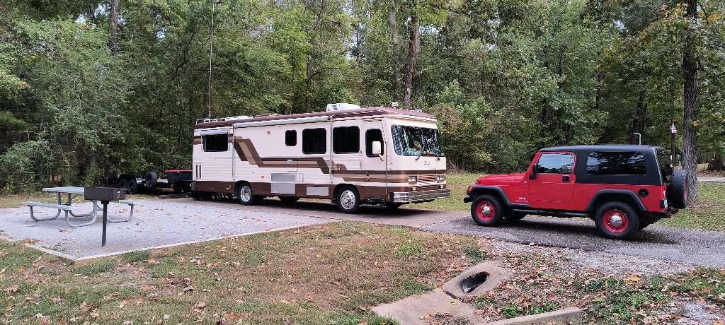 Last night we stayed in Williamsville Mississippi at Countryside RV Park . Gravel RV spots in a field on a farm with 50 amp service and full hookups . We were too long for the back in spots with the car hauler, but we were able to park in the grass since it's been so dry here . Super friendly folks running this campground , very accommodating .Today we finish our journey down the Natchez Trace Parkway and make our way home . It's been a wonderful trip with beautiful Autumn colors in the trees .