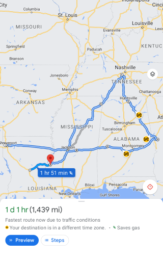 Friday morning we'll drive to Demopolis Alabama and stay at Foscue Creek COE campground until Monday the 16th . The morning of the 16th we start our last leg to Pine Mountain where we will stay until Monday the 23rd . When we leave Pine Mountain we are traveling to Huntsville Alabama to stay one night . On the 24th we'll travel to Pasquo Tennessee and catch the Natchez Trace Parkway and head south to Jackson Mississippi making it home by Friday the 27th .