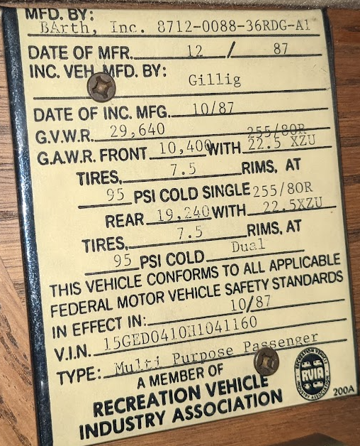 Steve VWI remembered their coach having a Cummins engine/Spartan chassis. Found the tag. Not this one, and still we don't know where it went.